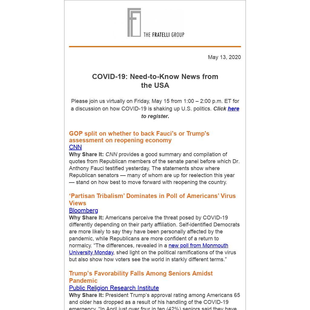 Why Share It: CNN provides a good summary and compilation of quotes from Republican members of the senate panel before which Dr. Anthony Fauci testified yesterday. The statements show where Republican senators — many of whom are up for reelection this year — stand on how best to move forward with reopening the country.