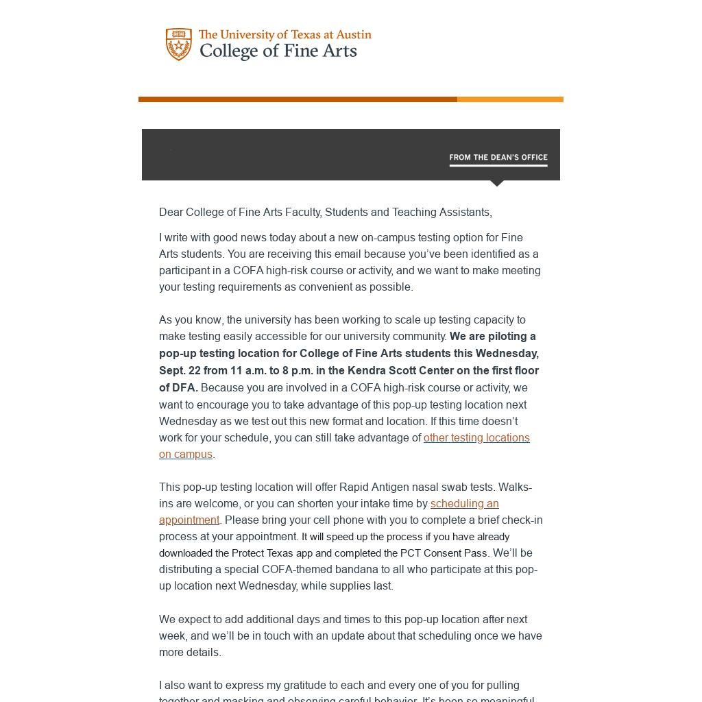 As you know, the university has been working to scale up testing capacity to make testing easily accessible for our university community. We are piloting a pop-up testing location for College of Fine Arts students this Wednesday, Sept. 22 from 11 a.m. to 8 p.m. in the Kendra Scott Center on the first floor of DFA. Because you are involved in a COFA high-risk course or activity, we want to encourage you to take advantage of this pop-up testing location next Wednesday as we test out this new format and location. If this time doesn’t work for your schedule, you can still take advantage of other testing locations on campus.