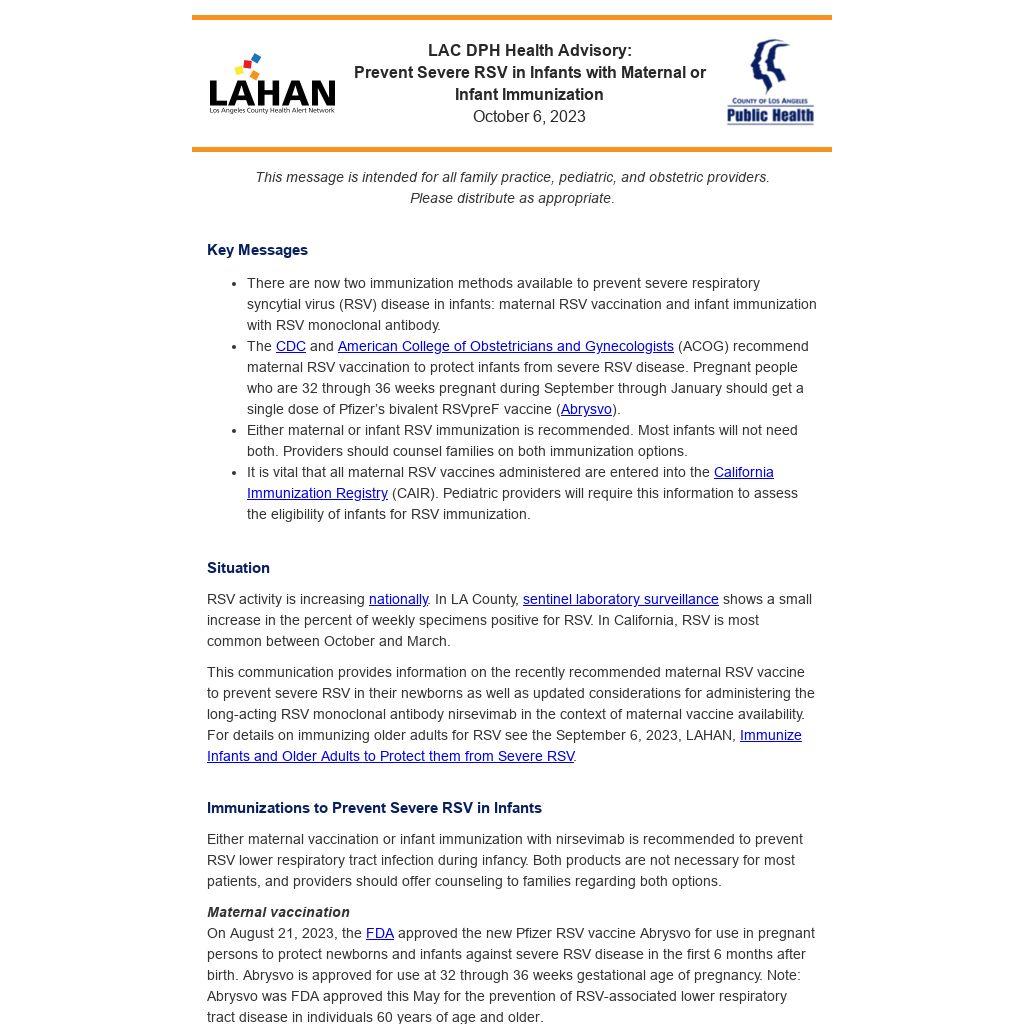 This communication provides information on the recently recommended maternal RSV vaccine to prevent severe RSV in their newborns as well as updated considerations for administering the long-acting RSV monoclonal antibody nirsevimab in the context of maternal vaccine availability. For details on immunizing older adults for RSV see the September 6, 2023, LAHAN, Immunize Infants and Older Adults to Protect them from Severe RSV.