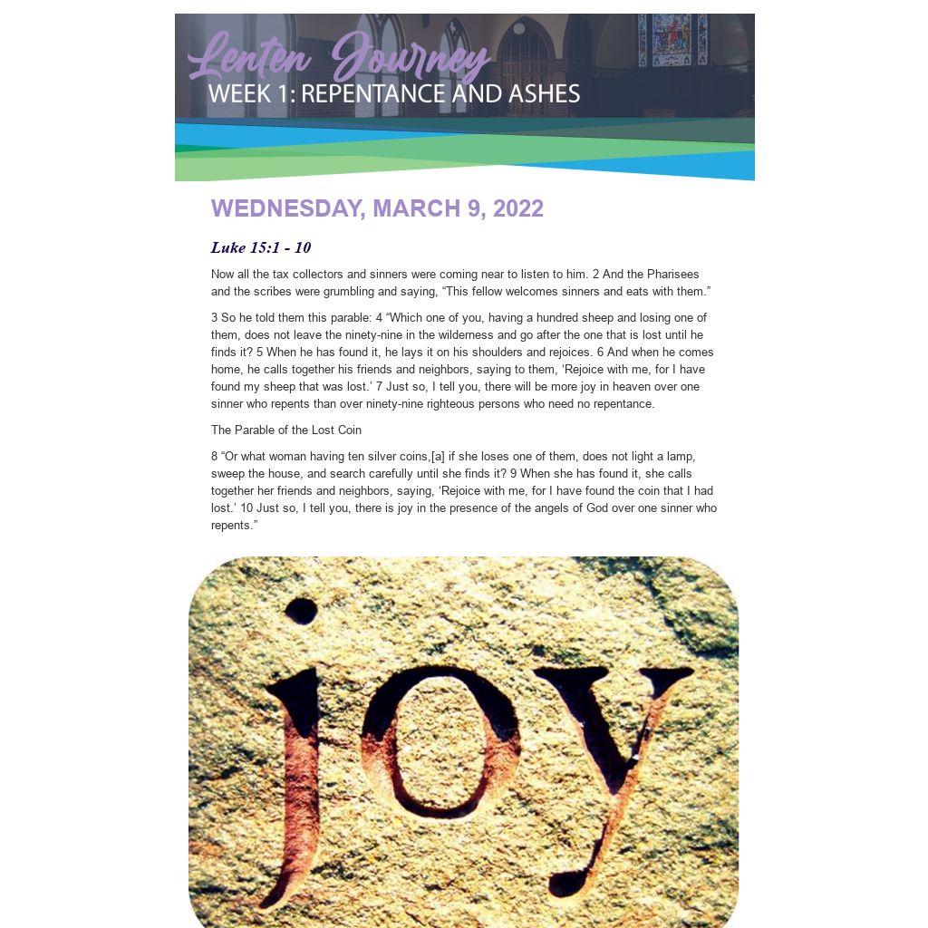 First, the “finder” of what was lost invites everyone around to “rejoice with me, for I have found [what was] lost” (vv. 6, 9, also v. 32). Second, after the first two parables, Jesus explicitly says: “Just so, I tell you,” there is “joy” in God’s presence over “one sinner who repents” (vv. 7, 10). Altogether, these parables offer three distinctive images for what repentance means—and joy is the resounding emotion.