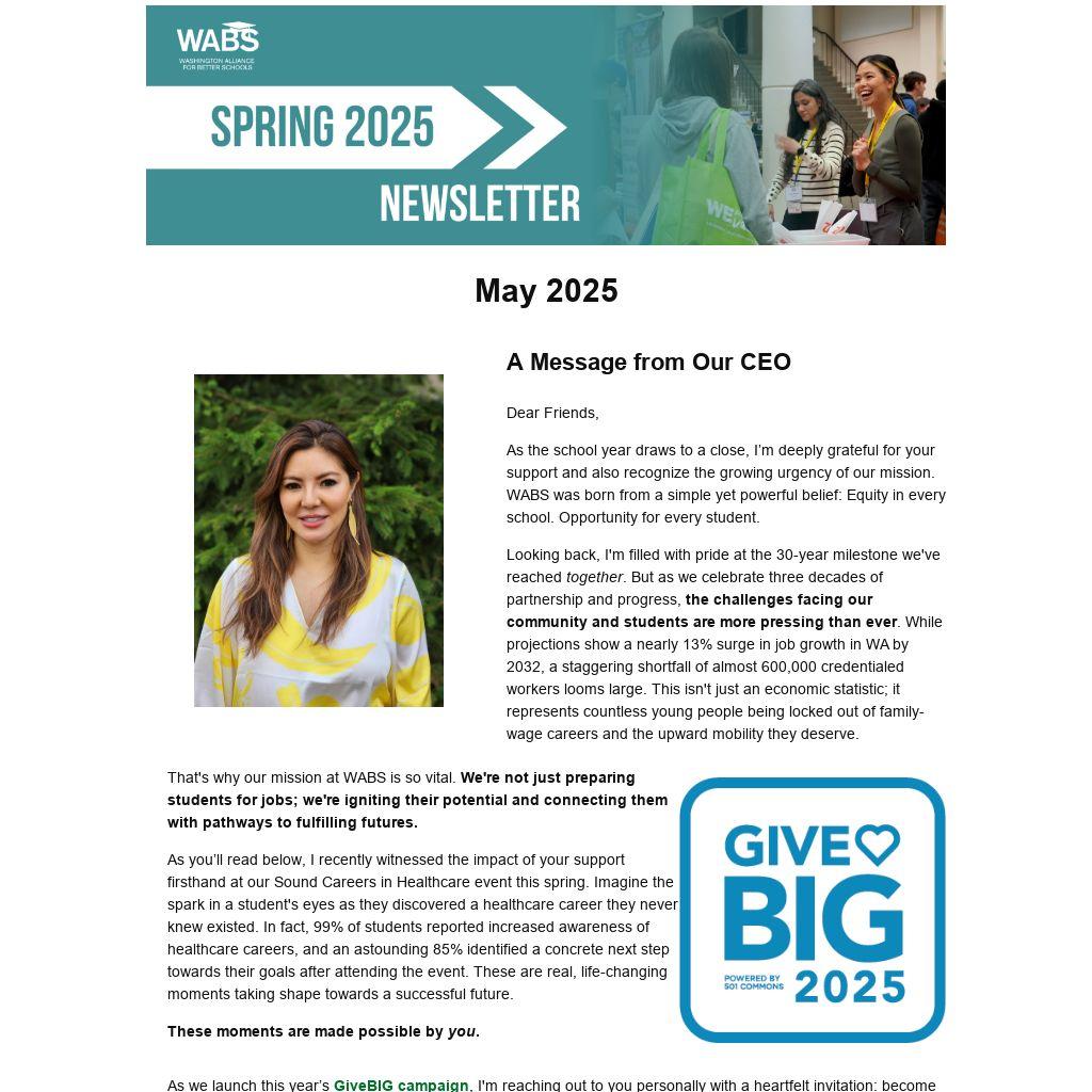 As the school year draws to a close, I’m deeply grateful for your support and also recognize the growing urgency of our mission. WABS was born from a simple yet powerful belief: Equity in every school. Opportunity for every student.
