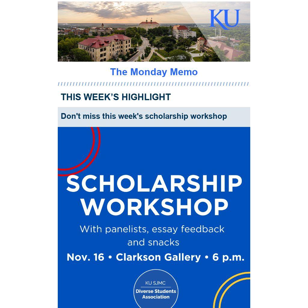 Please join the KU SJMC Diverse Students Association for a scholarship workshop on Thursday, Nov. 16 in the Clarkson Gallery at 6 p.m to learn more about financial aid and tips and feedback on your application essay. The workshop will feature panelists Frances Lyons, Himèe Kamatuka and Gerri Berendzen. The deadline to apply for scholarships is Dec. 15, 2023.