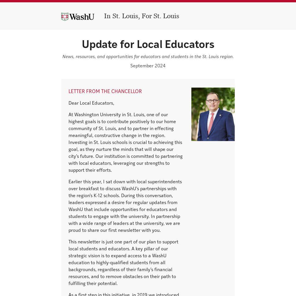 Earlier this year, I sat down with local superintendents over breakfast to discuss WashU’s partnerships with the region’s K-12 schools. During this conversation, leaders expressed a desire for regular updates from WashU that include opportunities for educators and students to engage with the university. In partnership with a wide range of leaders at the university, we are proud to share our first newsletter with you.