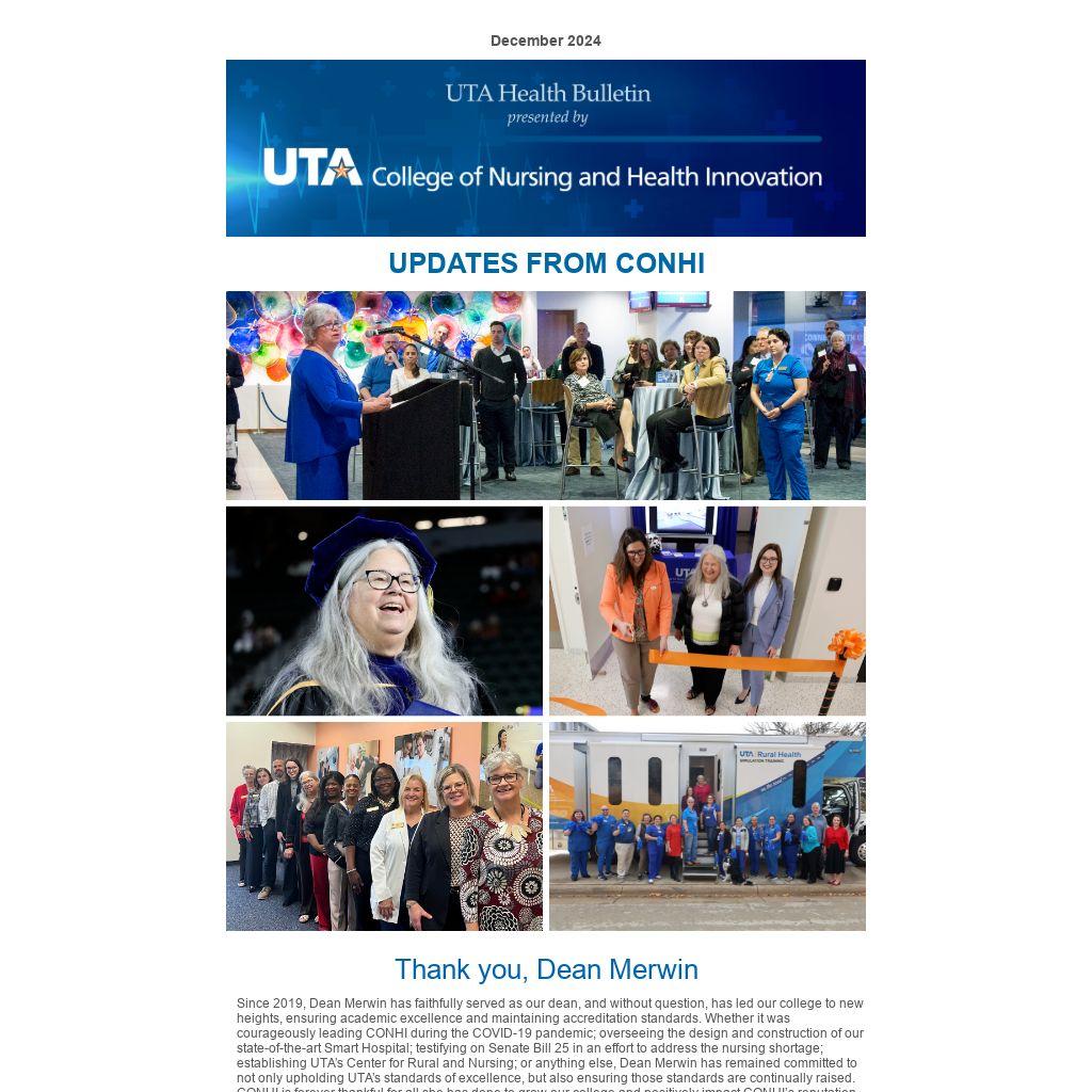Since 2019, Dean Merwin has faithfully served as our dean, and without question, has led our college to new heights, ensuring academic excellence and maintaining accreditation standards. Whether it was courageously leading CONHI during the COVID-19 pandemic; overseeing the design and construction of our state-of-the-art Smart Hospital; testifying on Senate Bill 25 in an effort to address the nursing shortage; establishing UTA’s Center for Rural and Nursing; or anything else, Dean Merwin has remained committed to not only upholding UTA’s standards of excellence, but also ensuring those standards are continually raised. CONHI is forever thankful for all she has done to grow our college and positively impact CONHI’s reputation locally, nationally, and around the world. Her legacy of fostering a culture of innovation, compassion, and academic excellence has inspired countless students, faculty, and staff, and will continue to guide us going forward.