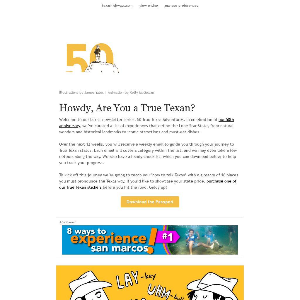 Over the next 12 weeks, you will receive a weekly email to guide you through your journey to True Texan status. Each email will cover a category within the list, and we may even take a few detours along the way. We also have a handy checklist, which you can download below, to help you track your progress.