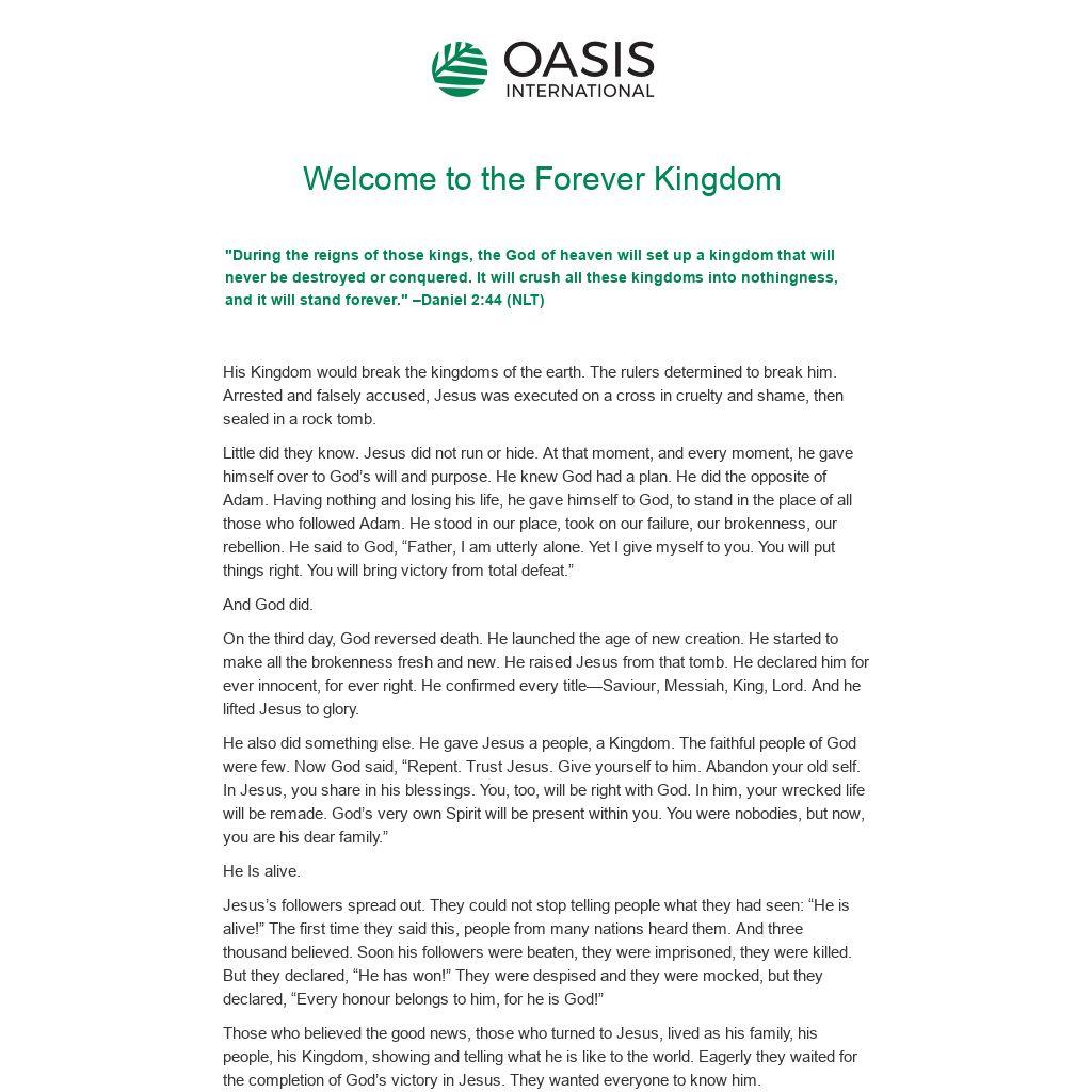 Jesus’s followers spread out. They could not stop telling people what they had seen: “He is alive!” The first time they said this, people from many nations heard them. And three thousand believed. Soon his followers were beaten, they were imprisoned, they were killed. But they declared, “He has won!” They were despised and they were mocked, but they declared, “Every honour belongs to him, for he is God!”