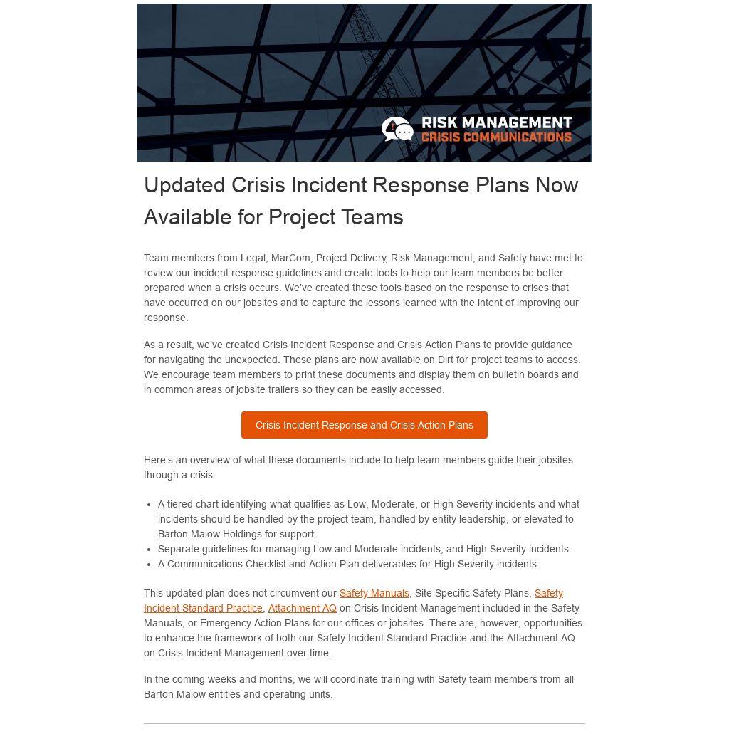 Team members from Legal, MarCom, Project Delivery, Risk Management, and Safety have met to review our incident response guidelines and create tools to help our team members be better prepared when a crisis occurs. We’ve created these tools based on the response to crises that have occurred on our jobsites and to capture the lessons learned with the intent of improving our response.