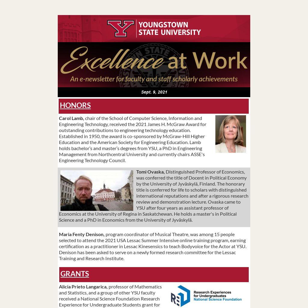 Excellence at Work, published by the YSU Office of Marketing and Communications, recognizes and celebrates the scholarly work and honors of the faculty and staff of Youngstown State University. To submit items for inclusion, complete the online form.For more information, contact Ron Cole, director of University Communications, at racole01@ysu.edu or 330-941-3285, or Becky Rose, assistant director of University Communications, at rarose01@ysu.edu or 330-941-2159.