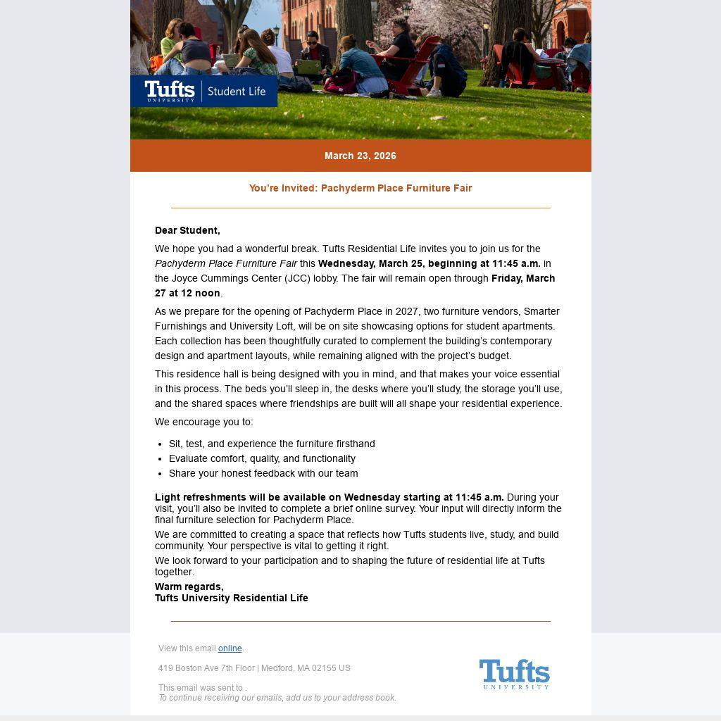 We hope you had a wonderful break. Tufts Residential Life invites you to join us for the Pachyderm Place Furniture Fair this Wednesday, March 25, beginning at 11:45 a.m. in the Joyce Cummings Center (JCC) lobby. The fair will remain open through Friday, March 27 at 12 noon.