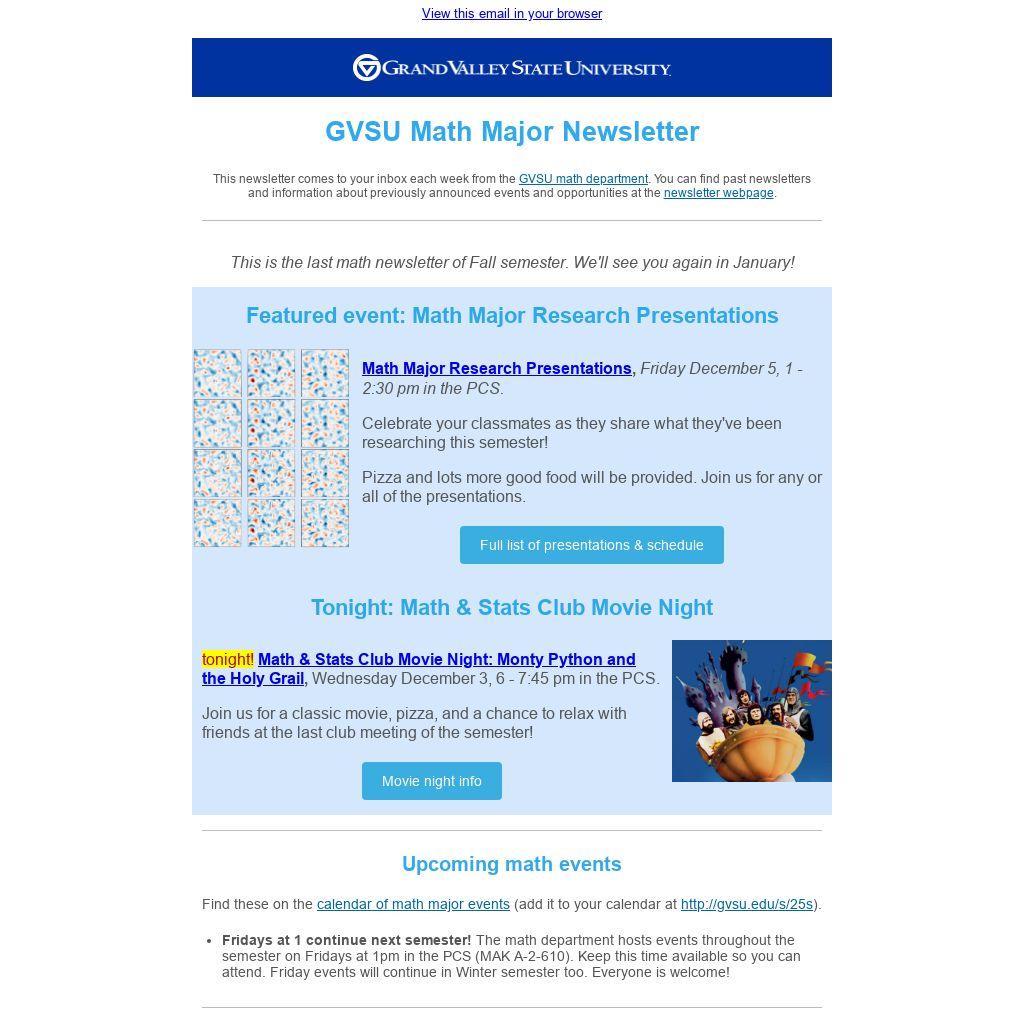 This newsletter comes to your inbox each week from the GVSU math department. You can find past newsletters and information about previously announced events and opportunities at the newsletter webpage.