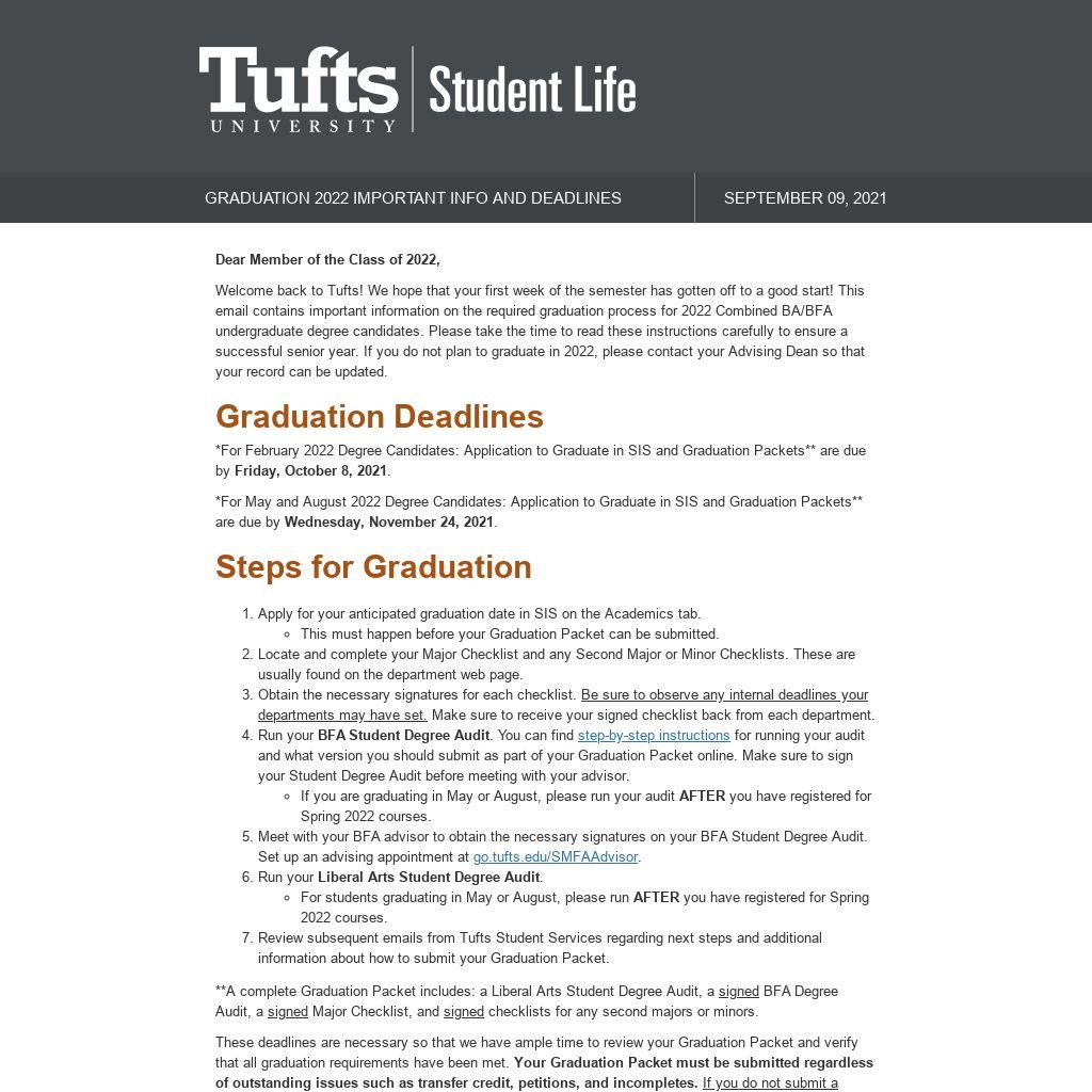 Welcome back to Tufts! We hope that your first week of the semester has gotten off to a good start! This email contains important information on the required graduation process for 2022 Combined BA/BFA undergraduate degree candidates. Please take the time to read these instructions carefully to ensure a successful senior year. If you do not plan to graduate in 2022, please contact your Advising Dean so that your record can be updated.