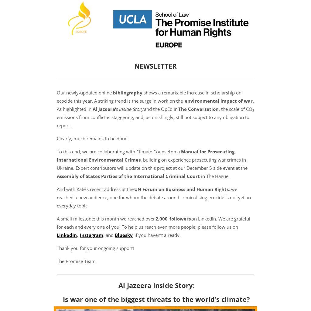 To this end, we are collaborating with Climate Counsel on a Manual for Prosecuting International Environmental Crimes, building on experience prosecuting war crimes in Ukraine. Expert contributors will update on this project at our December 5 side event at the Assembly of States Parties of the International Criminal Court in The Hague.
