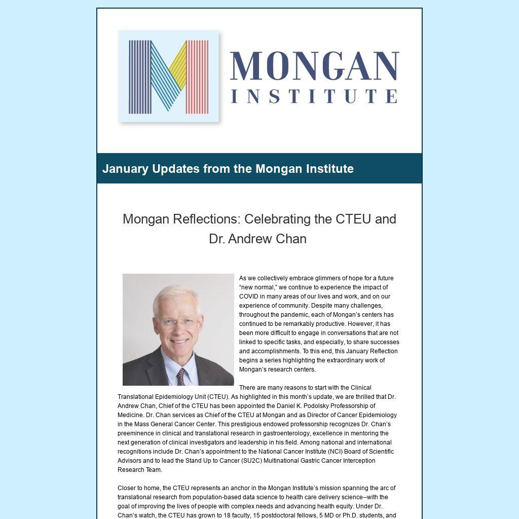 There are many reasons to start with the Clinical Translational Epidemiology Unit (CTEU). As highlighted in this month’s update, we are thrilled that Dr. Andrew Chan, Chief of the CTEU has been appointed the Daniel K. Podolsky Professorship of Medicine. Dr. Chan services as Chief of the CTEU at Mongan and as Director of Cancer Epidemiology in the Mass General Cancer Center. This prestigious endowed professorship recognizes Dr. Chan’s preeminence in clinical and translational research in gastroenterology, excellence in mentoring the next generation of clinical investigators and leadership in his field. Among national and international recognitions include Dr. Chan’s appointment to the National Cancer Institute (NCI) Board of Scientific Advisors and to lead the Stand Up to Cancer (SU2C) Multinational Gastric Cancer Interception Research Team.