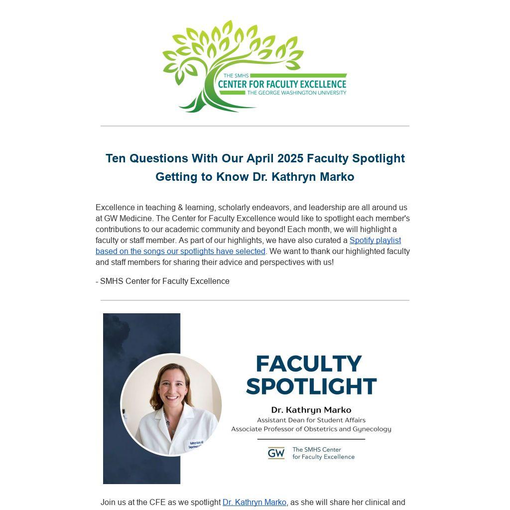 Excellence in teaching & learning, scholarly endeavors, and leadership are all around us at GW Medicine. The Center for Faculty Excellence would like to spotlight each member's contributions to our academic community and beyond! Each month, we will highlight a faculty or staff member. As part of our highlights, we have also curated a Spotify playlist based on the songs our spotlights have selected. We want to thank our highlighted faculty and staff members for sharing their advice and perspectives with us!