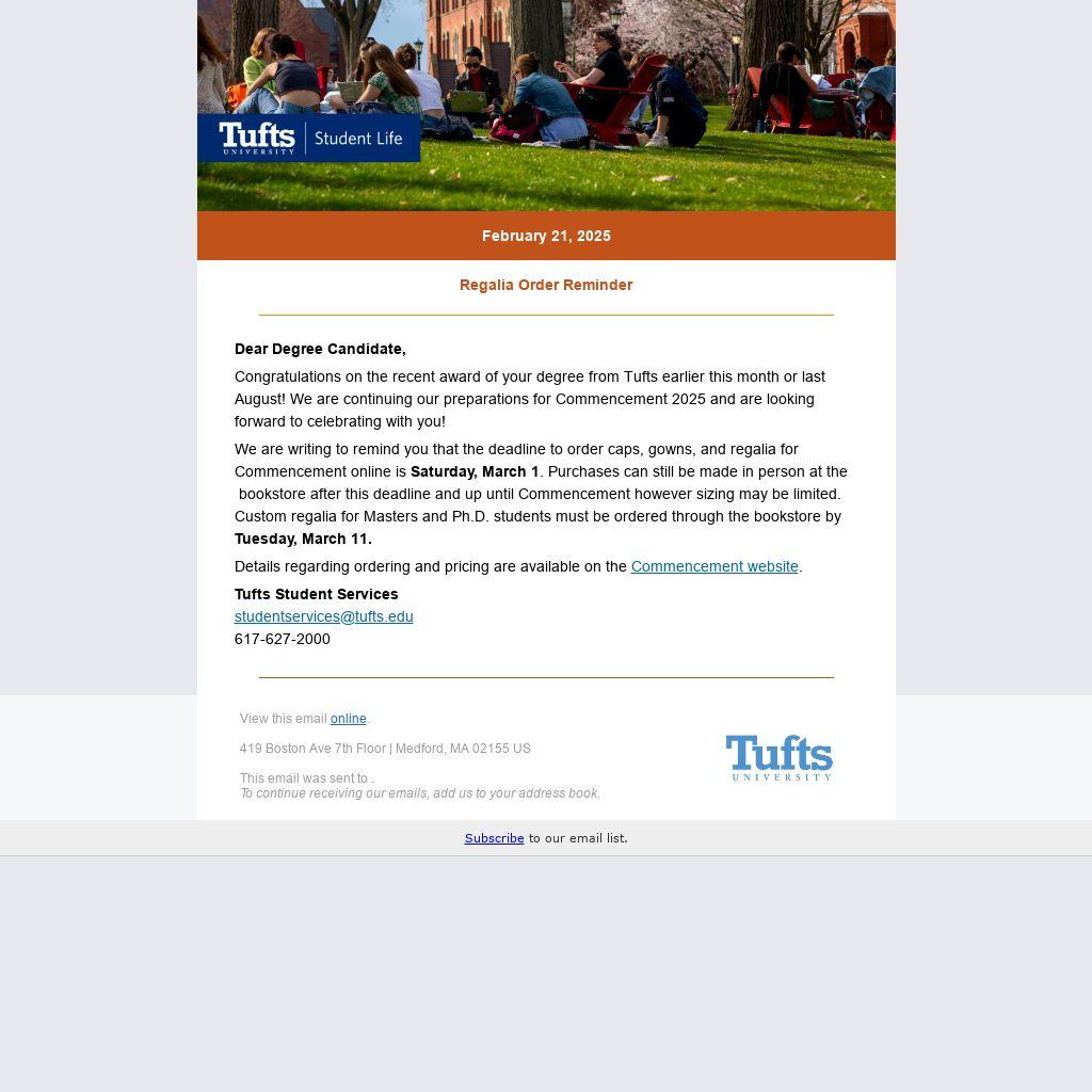 Congratulations on the recent award of your degree from Tufts earlier this month or last August! We are continuing our preparations for Commencement 2025 and are looking forward to celebrating with you!