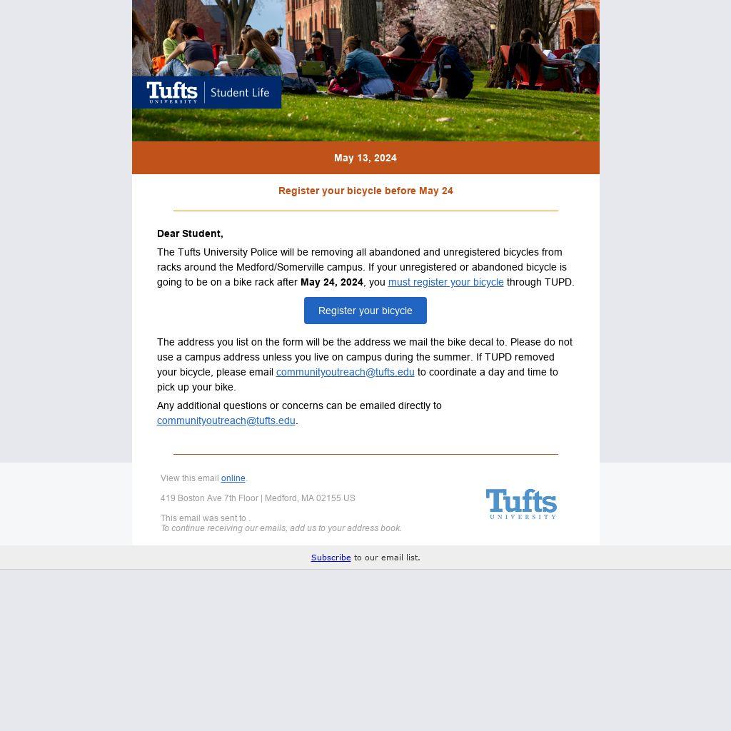 The Tufts University Police will be removing all abandoned and unregistered bicycles from racks around the Medford/Somerville campus. If your unregistered or abandoned bicycle is going to be on a bike rack after May 24, 2024, you must register your bicycle through TUPD.