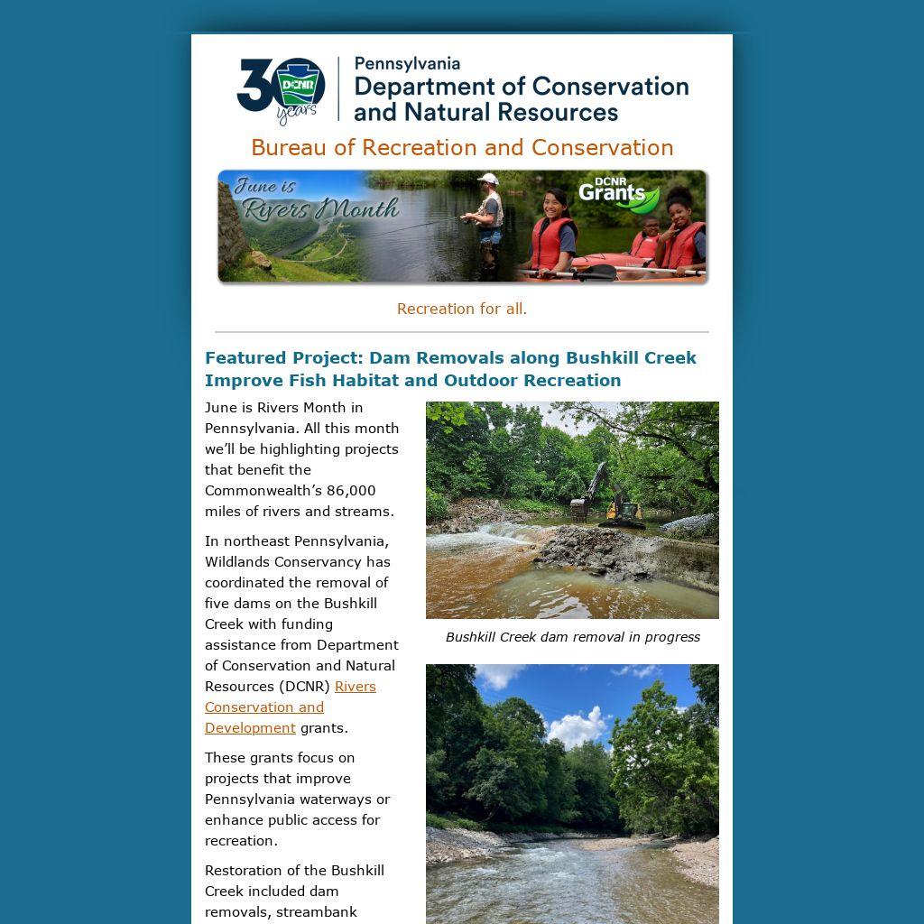 In northeast Pennsylvania, Wildlands Conservancy has coordinated the removal of five dams on the Bushkill Creek with funding assistance from Department of Conservation and Natural Resources (DCNR) Rivers Conservation and Development grants.