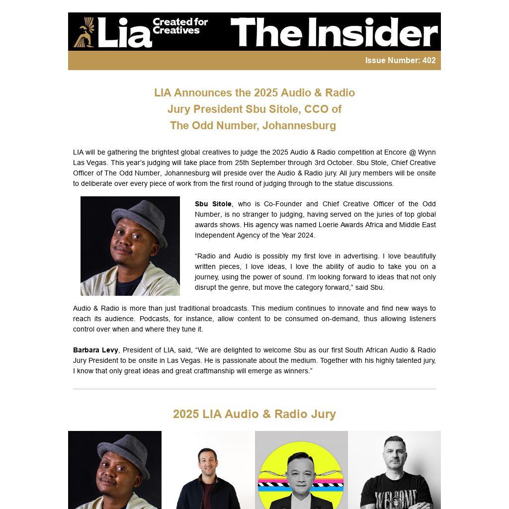 LIA will be gathering the brightest global creatives to judge the 2025 Audio & Radio competition at Encore @ Wynn Las Vegas. This year’s judging will take place from 25th September through 3rd October. Sbu Stole, Chief Creative Officer of The Odd Number, Johannesburg will preside over the Audio & Radio jury. All jury members will be onsite to deliberate over every piece of work from the first round of judging through to the statue discussions.