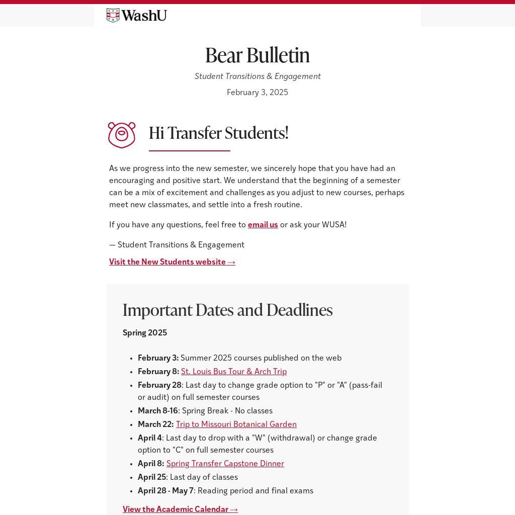 Meet your WUSAs and fellow transfer and exchange students at the Alumni Lot at 9:50 AM on February 8 for a free trip to and in the Gateway Arch and St. Louis Bus tour with a Missouri History Museum Guide. The bus will leave promptly at 10:00 AM. We will return to campus at 2:00 PM.