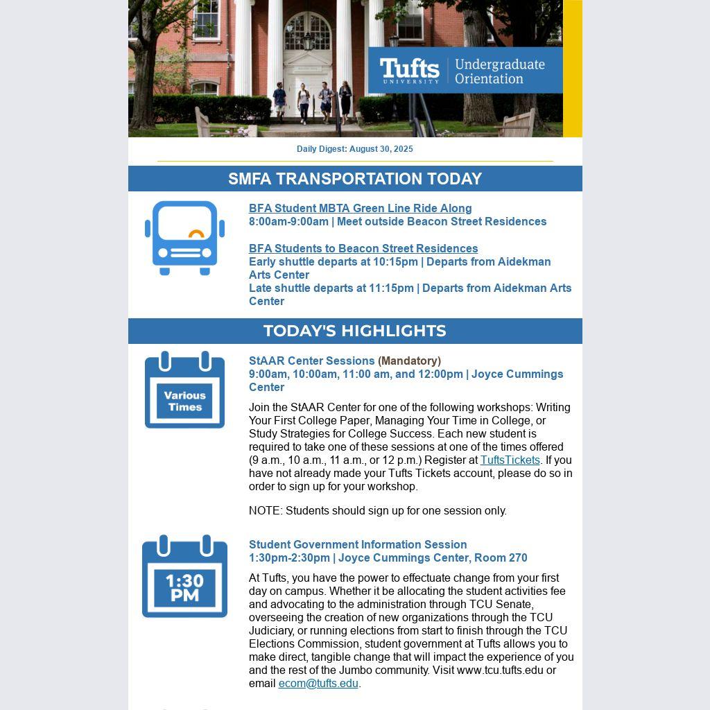 Tufts University Undergraduate Orientation is committed to providing equal access to our services, events and programs. If you require accommodations for any part of Undergraduate Orientation, please contact orientation@tufts.edu or 617-627-4678.