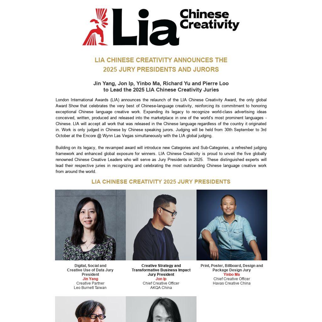 Barbara Levy, President of LIA, stated: “We are thrilled to welcome these visionary Creative Leaders as our 2025 Jury Presidents for our Chinese Creativity Show. Their expertise, creativity, and dedication to excellence will ensure that the most groundbreaking and impactful Chinese language work is recognized on a global stage.”