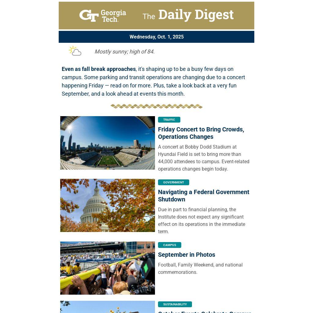 Even as fall break approaches, it's shaping up to be a busy few days on campus. Some parking and transit operations are changing due to a concert happening Friday — read on for more. Plus, take a look back at a very fun September, and a look ahead at events this month.