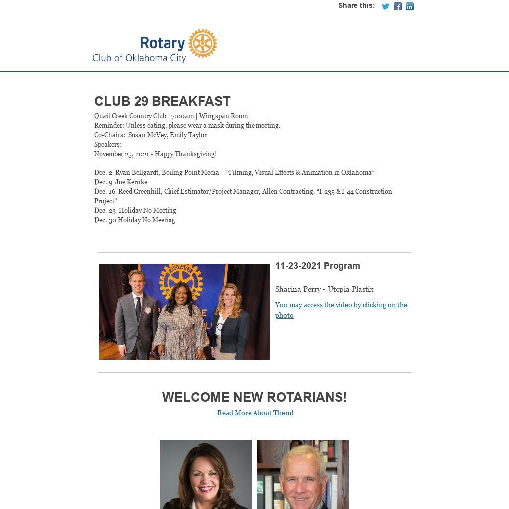 This past year we lost one of our beloved Rotarians, Mike McAuliffe. Saturday, December 4th at 6:00pm, the Oklahoma City Holiday River Parade at the Boathouse District will take place and the event will include a tribute to parade founder, and fellow Rotarian, Mike McAuliffe. It will include Santa, Santa’s elves trick water skiing show, a fireworks show, decorated boats on the Oklahoma River, a laser light show and a performance by Olivia Kay… All free and open to the public just as founder Mike McAuliffe had envisioned.