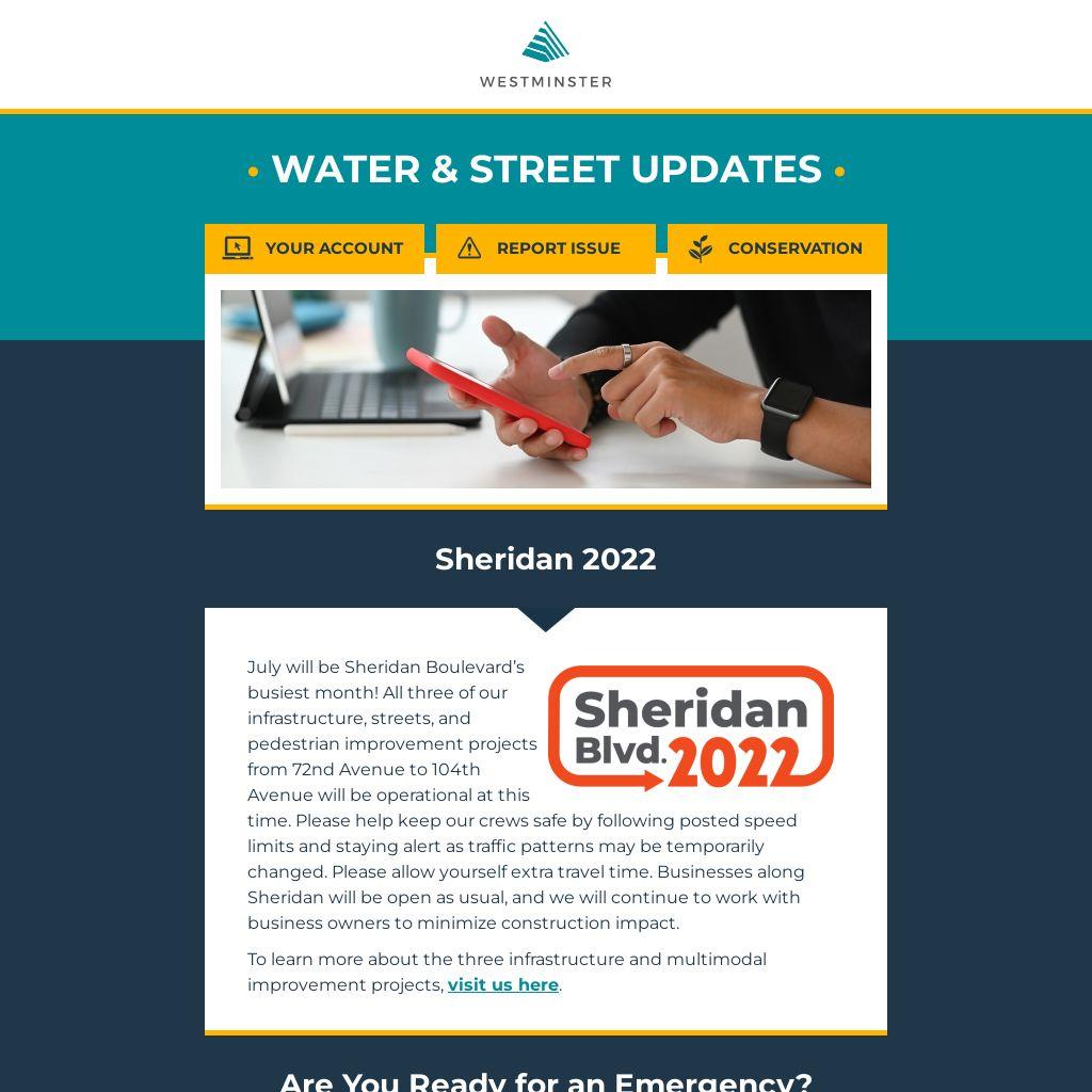 July will be Sheridan Boulevard’s busiest month! All three of our infrastructure, streets, and pedestrian improvement projects from 72nd Avenue to 104th Avenue will be operational at this time. Please help keep our crews safe by following posted speed limits and staying alert as traffic patterns may be temporarily changed. Please allow yourself extra travel time. Businesses along Sheridan will be open as usual, and we will continue to work with business owners to minimize construction impact.