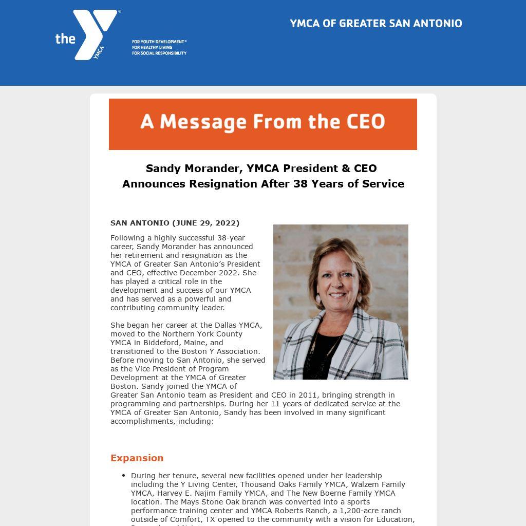 The Board will quickly initiate our search for the next CEO of the YMCA of Greater San Antonio. Our CEO Transition Committee will leverage resources available to us through the YMCA of the USA to execute a formal search process and will consider local, regional, and nationwide candidates, including both YMCA-affiliated and non-affiliated leaders. As was the case when Sandy was selected 11 years ago through a similar process, our next CEO will be tasked with boldly leading our organization with a focus on sustained positive impacts on children, families, and our broader community. We intend to name the next CEO by the end of 2022.
