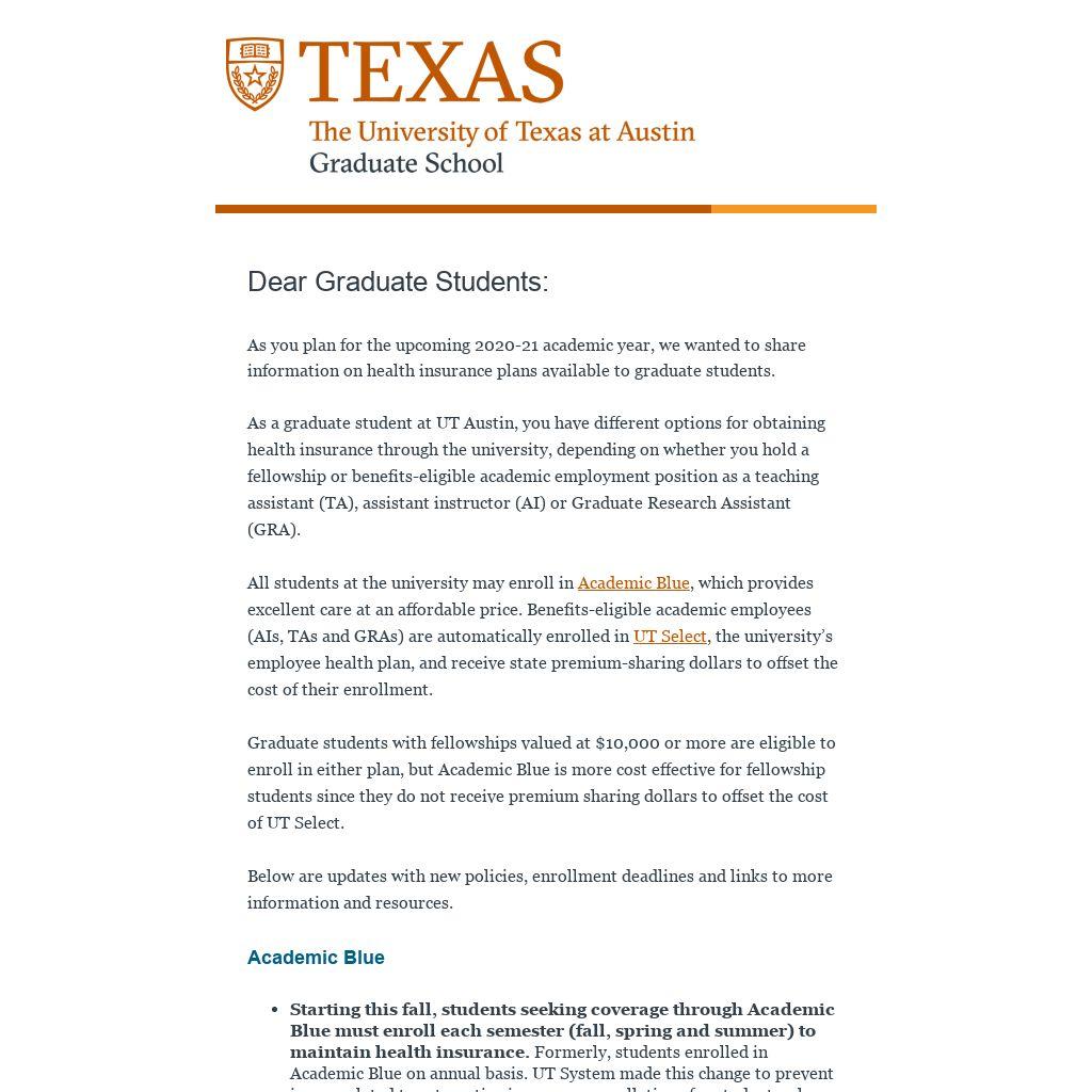 As a graduate student at UT Austin, you have different options for obtaining health insurance through the university, depending on whether you hold a fellowship or benefits-eligible academic employment position as a teaching assistant (TA), assistant instructor (AI) or Graduate Research Assistant (GRA).