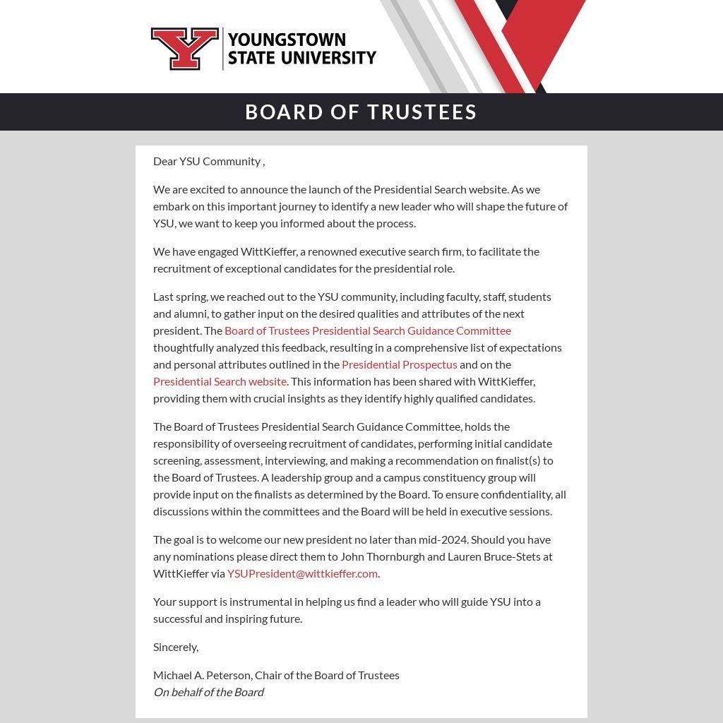 Last spring, we reached out to the YSU community, including faculty, staff, students and alumni, to gather input on the desired qualities and attributes of the next president. The Board of Trustees Presidential Search Guidance Committee thoughtfully analyzed this feedback, resulting in a comprehensive list of expectations and personal attributes outlined in the Presidential Prospectus and on the Presidential Search website. This information has been shared with WittKieffer, providing them with crucial insights as they identify highly qualified candidates.