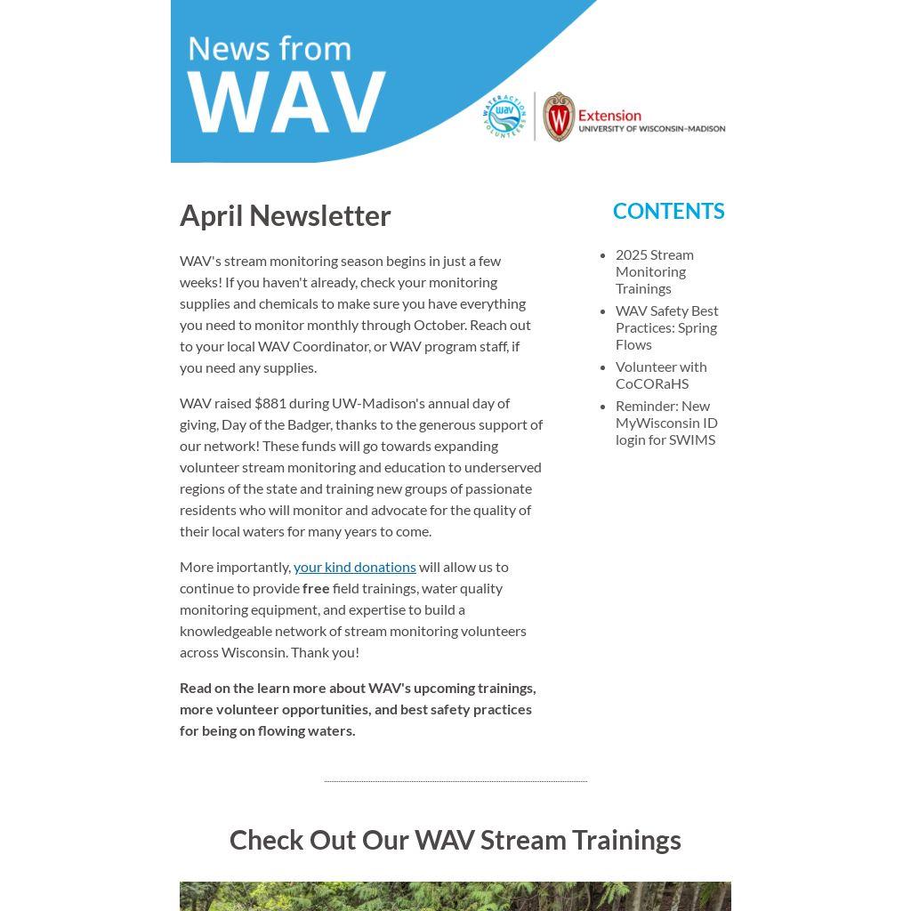 The Water Action Volunteers (WAV) stream monitoring program is an ongoing partnership between the University of Wisconsin–Madison Division of Extension, the Wisconsin Department of Natural Resources, and nearly 50 local partner groups and organizations.