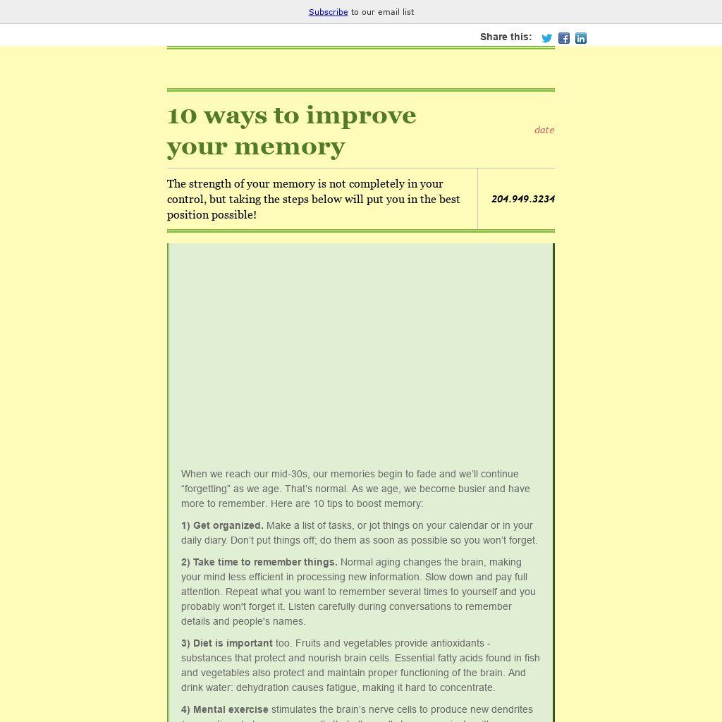 When we reach our mid-30s, our memories begin to fade and we’ll continue “forgetting” as we age. That’s normal. As we age, we become busier and have more to remember. Here are 10 tips to boost memory: