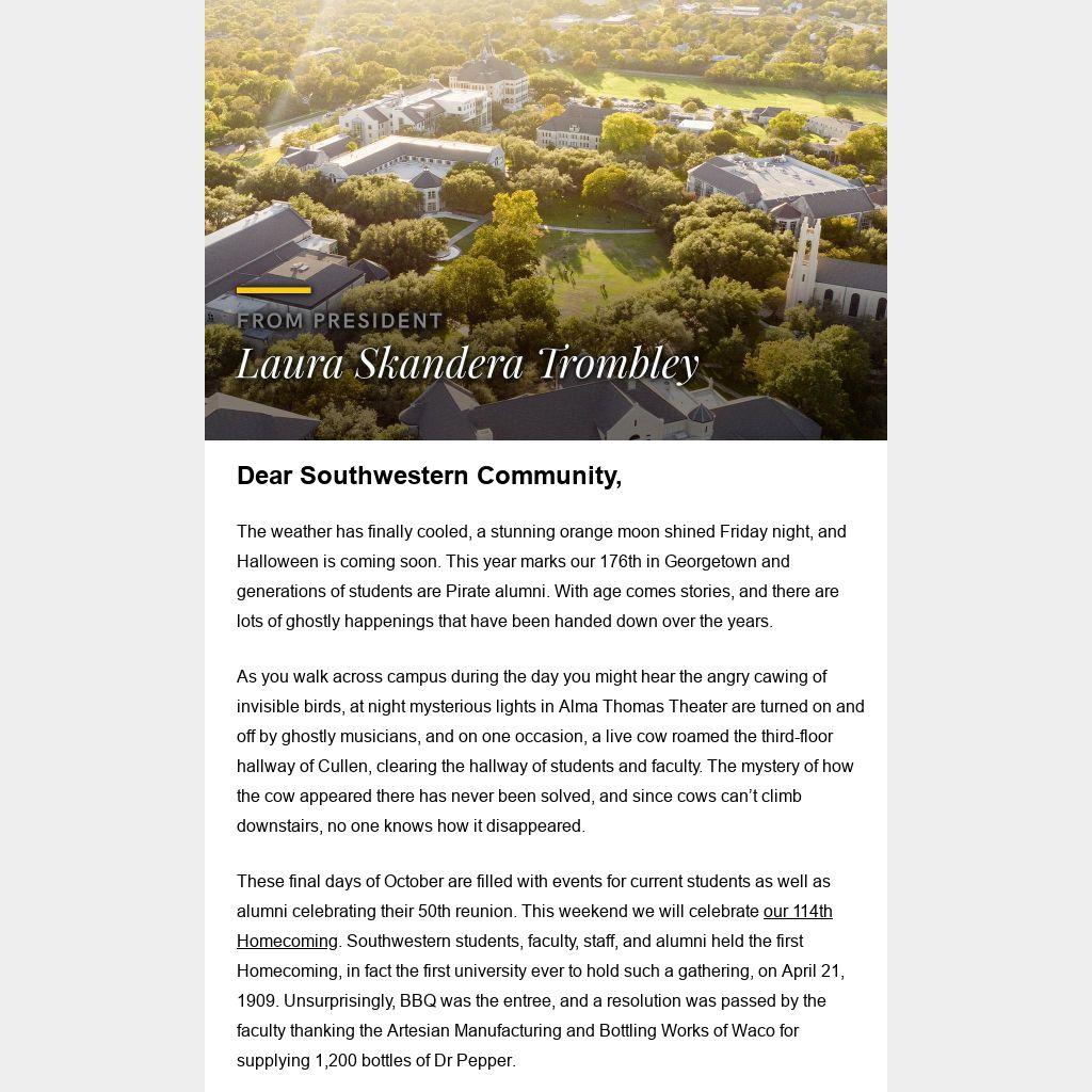 These final days of October are filled with events for current students as well as alumni celebrating their 50th reunion. This weekend we will celebrate our 114th Homecoming. Southwestern students, faculty, staff, and alumni held the first Homecoming, in fact the first university ever to hold such a gathering, on April 21, 1909. Unsurprisingly, BBQ was the entree, and a resolution was passed by the faculty thanking the Artesian Manufacturing and Bottling Works of Waco for supplying 1,200 bottles of Dr Pepper.