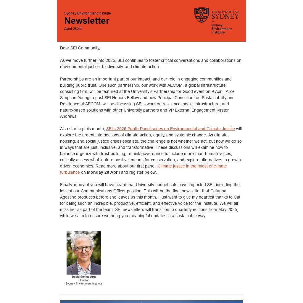 Finally, many of you will have heard that University budget cuts have impacted SEI, including the loss of our Communications Officer position. This will be the final newsletter that Catarina Agostino produces before she leaves us this month. I just want to give my heartfelt thanks to Cat for being such an incredible, productive, efficient, and effective voice for the Institute. We will all miss her as part of the team. SEI newsletters will transition to quarterly editions from May 2025, while we aim to ensure we bring you meaningful updates in a sustainable way.