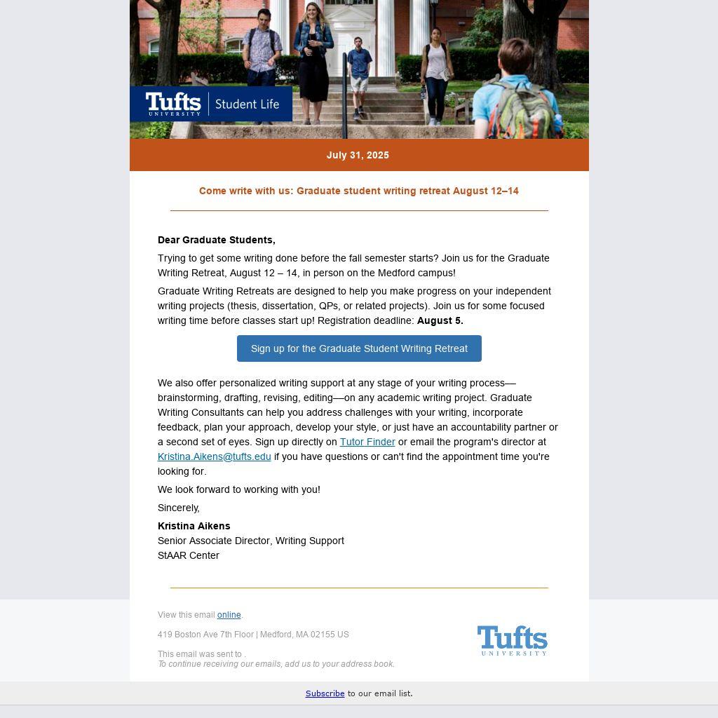 Trying to get some writing done before the fall semester starts? Join us for the Graduate Writing Retreat, August 12 – 14, in person on the Medford campus!