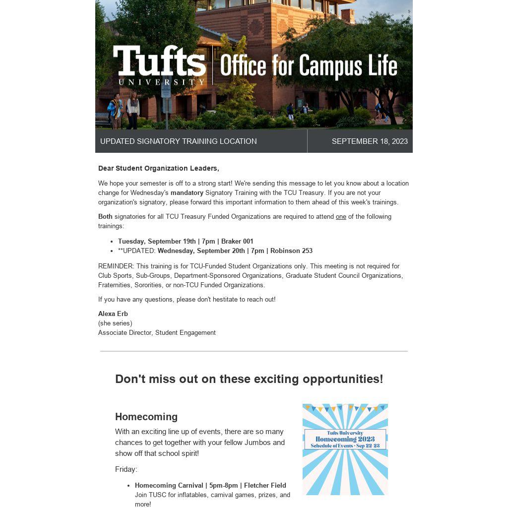 We hope your semester is off to a strong start! We're sending this message to let you know about a location change for Wednesday's mandatory Signatory Training with the TCU Treasury. If you are not your organization's signatory, please forward this important information to them ahead of this week's trainings.