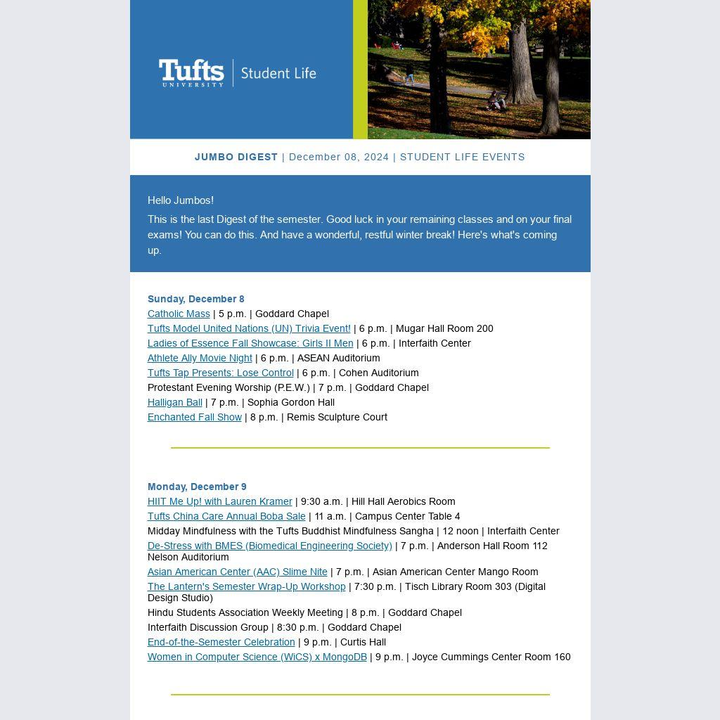 Students and Student Organizations can submit events to JumboLife! Add your event by Thursday at 12 noon each week, and we'll include it in the Jumbo Digest on Sunday.