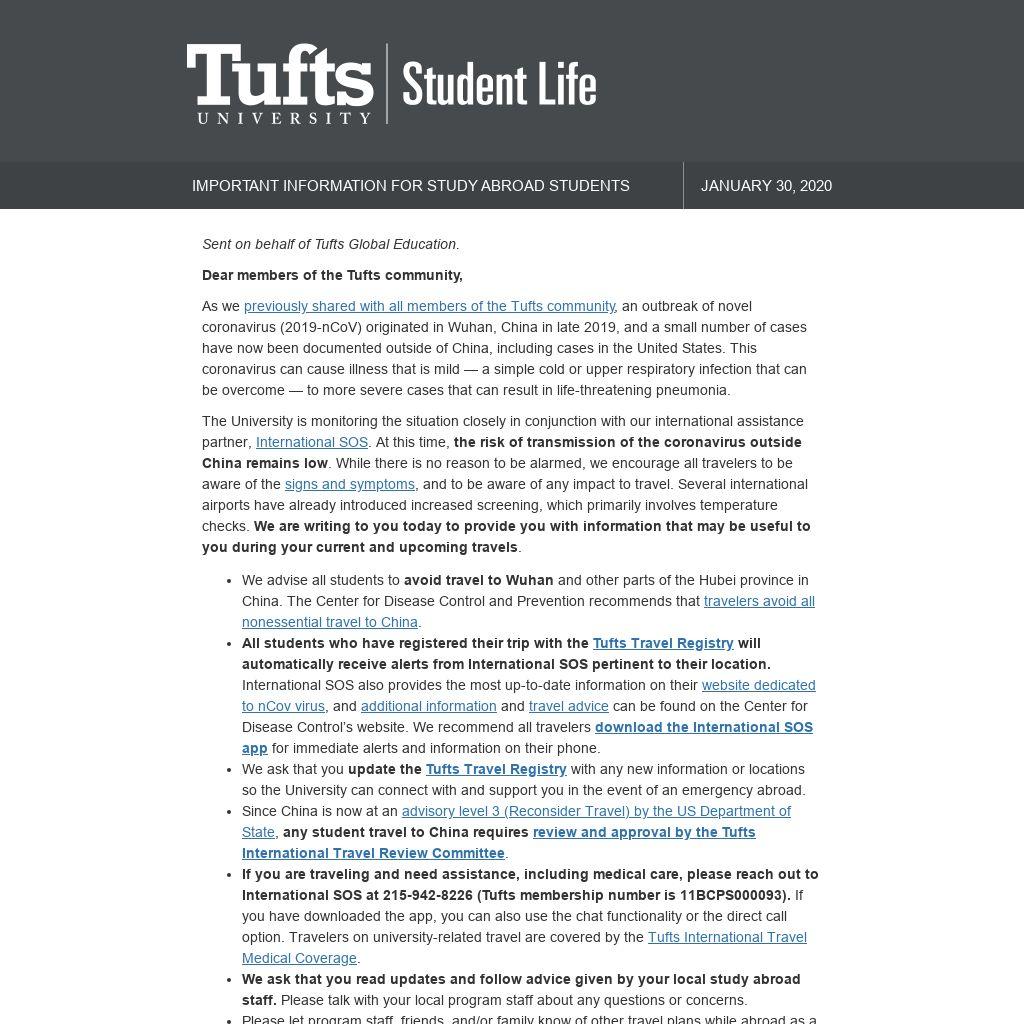 As we previously shared with all members of the Tufts community, an outbreak of novel coronavirus (2019-nCoV) originated in Wuhan, China in late 2019, and a small number of cases have now been documented outside of China, including cases in the United States. This coronavirus can cause illness that is mild — a simple cold or upper respiratory infection that can be overcome — to more severe cases that can result in life-threatening pneumonia.