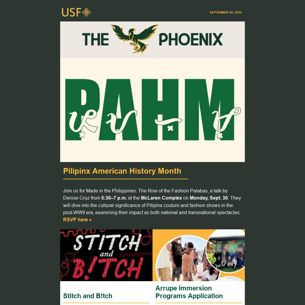 The Phoenix is a weekly e-newsletter sent by Student Leadership and Engagement to help students stay connected and get involved. It features campus events, leadership opportunities, athletic games, workshops, retreats, and more. Why “The Phoenix” title? The Phoenix has long been associated with the history and growth of USF as well as St. Ignatius, who encouraged followers to “go forth and set the world on fire.” Learn more »
