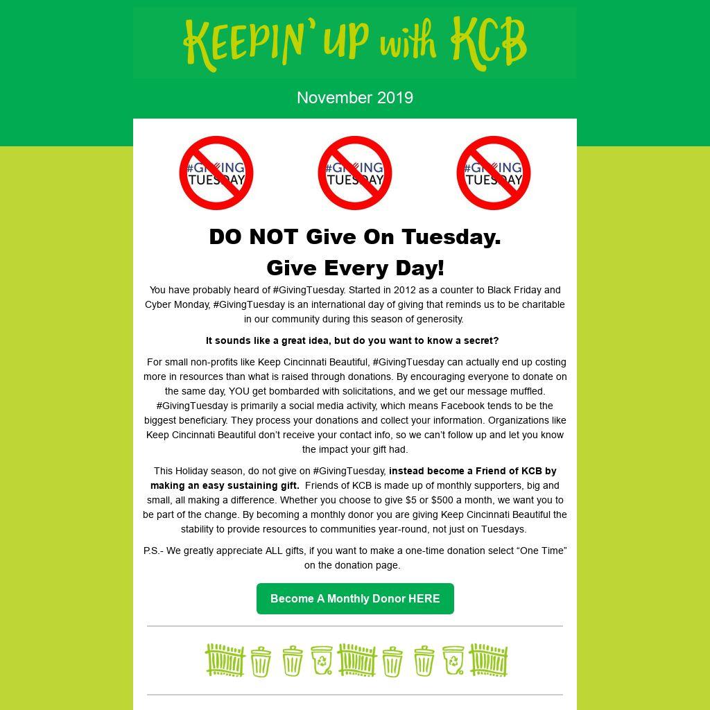 For small non-profits like Keep Cincinnati Beautiful, #GivingTuesday can actually end up costing more in resources than what is raised through donations. By encouraging everyone to donate on the same day, YOU get bombarded with solicitations, and we get our message muffled. #GivingTuesday is primarily a social media activity, which means Facebook tends to be the biggest beneficiary. They process your donations and collect your information. Organizations like Keep Cincinnati Beautiful don’t receive your contact info, so we can’t follow up and let you know the impact your gift had.