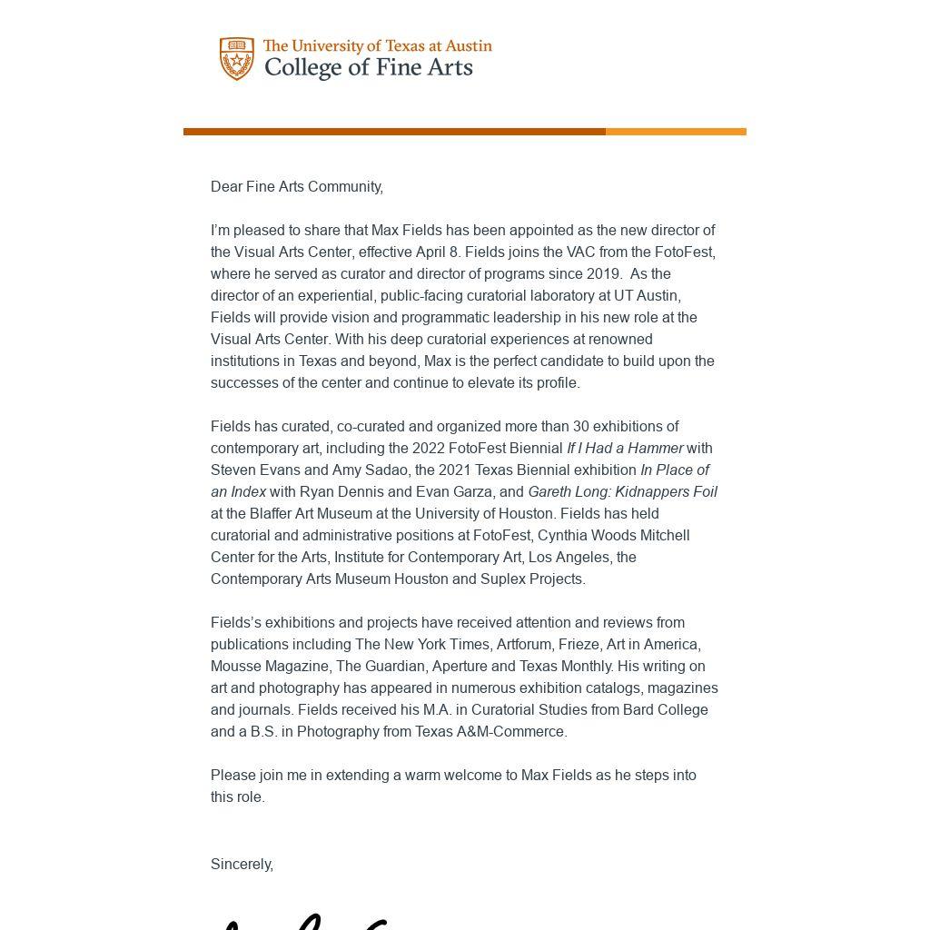 I’m pleased to share that Max Fields has been appointed as the new director of the Visual Arts Center, effective April 8. Fields joins the VAC from the FotoFest, where he served as curator and director of programs since 2019. As the director of an experiential, public-facing curatorial laboratory at UT Austin, Fields will provide vision and programmatic leadership in his new role at the Visual Arts Center. With his deep curatorial experiences at renowned institutions in Texas and beyond, Max is the perfect candidate to build upon the successes of the center and continue to elevate its profile.