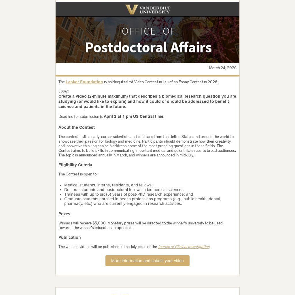 The contest invites early-career scientists and clinicians from the United States and around the world to showcase their passion for biology and medicine. Participants should demonstrate how their creativity and innovative thinking can help address some of the most pressing questions in these fields. The Contest aims to build skills in communicating important medical and scientific issues to broad audiences. The topic is announced annually in March, and winners are announced in mid-July.