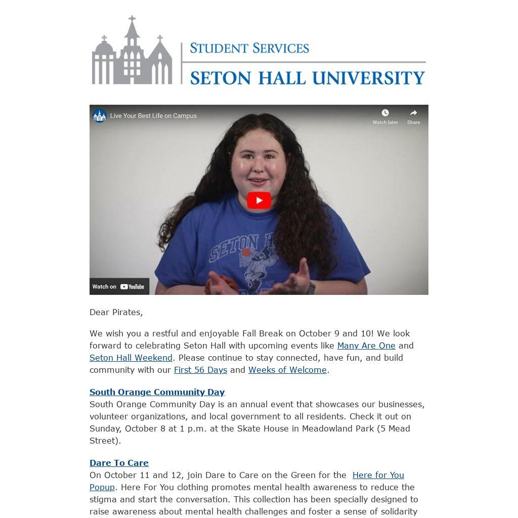 Seton Hall will once again partner with Walgreens to offer flu and COVID vaccinations on campus on October 11 and November 11 from 10 a.m. to 3 p.m. in the University Center Event Room. Click here to register. Email healthservices@shu.edu with any questions.
