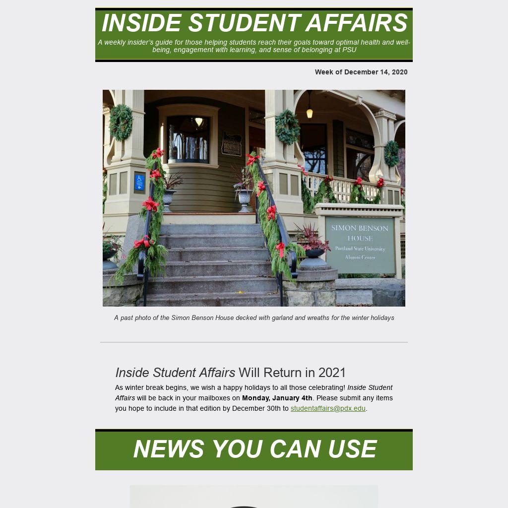 As winter break begins, we wish a happy holidays to all those celebrating! Inside Student Affairs will be back in your mailboxes on Monday, January 4th. Please submit any items you hope to include in that edition by December 30th to studentaffairs@pdx.edu.
