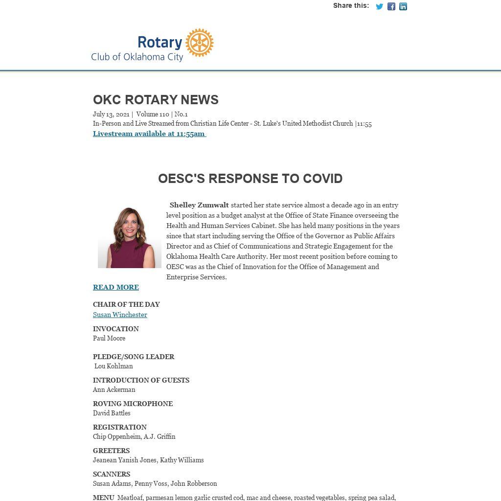 | OKC Rotary NewsJuly 13, 2021 | Volume 110 | No.1 In-Person and Live Streamed from Christian Life Center - St. Luke's United Methodist Church |11:55