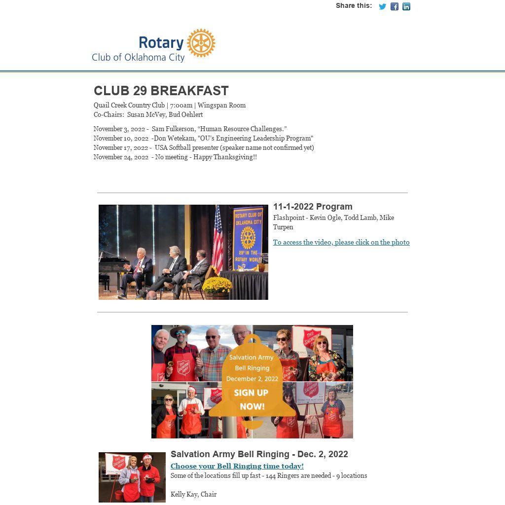 Nov. 8, 2022 - Coleman Clark – Story of BC Clark Nov. 15, 2022 - Trait Thompson - Oklahoma Capitol Remodel – High School Rotarian Guests