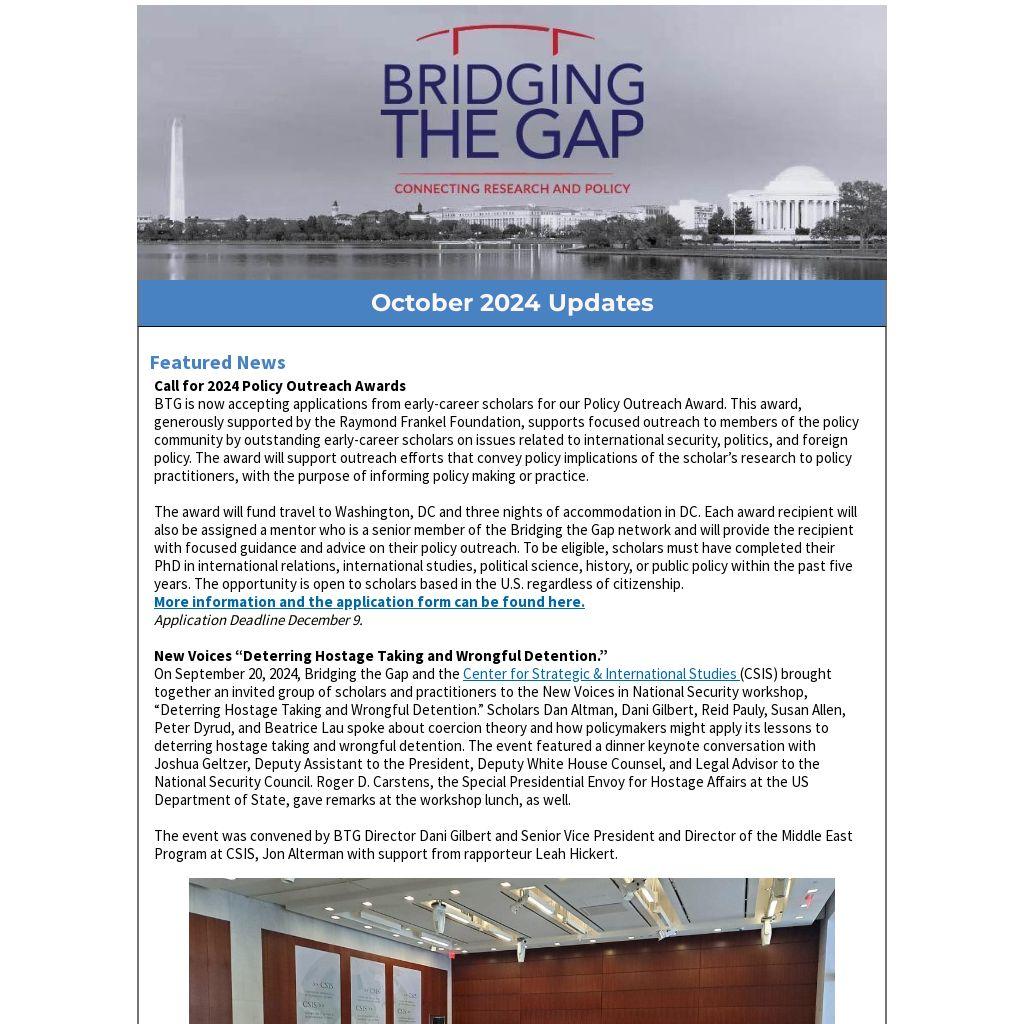 On September 20, 2024, Bridging the Gap and the Center for Strategic & International Studies (CSIS) brought together an invited group of scholars and practitioners to the New Voices in National Security workshop, “Deterring Hostage Taking and Wrongful Detention.” Scholars Dan Altman, Dani Gilbert, Reid Pauly, Susan Allen, Peter Dyrud, and Beatrice Lau spoke about coercion theory and how policymakers might apply its lessons to deterring hostage taking and wrongful detention. The event featured a dinner keynote conversation with Joshua Geltzer, Deputy Assistant to the President, Deputy White House Counsel, and Legal Advisor to the National Security Council. Roger D. Carstens, the Special Presidential Envoy for Hostage Affairs at the US Department of State, gave remarks at the workshop lunch, as well.