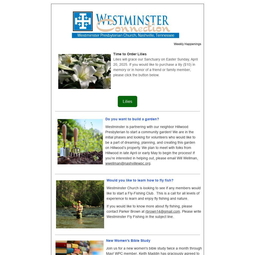 Westminster is partnering with our neighbor Hillwood Presbyterian to start a community garden! We are in the initial phases and looking for volunteers who would like to be a part of dreaming, planning, and creating this garden on Hillwood’s property. We plan to meet with folks from Hillwood in late April or early May to begin the process! If you’re interested in helping out, please email Will Wellman, wwellman@nashvillewpc.org.