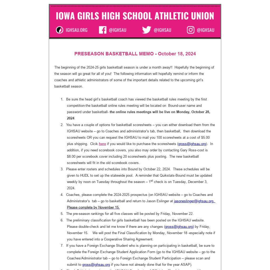 4. Coaches, please complete the 2024-2025 prospectus (on IGHSAU website – go to Coaches and Administrator’s tab – go to basketball and return to Jason Eslinger at jasoneslinger@ighsau.org. Please complete by November 15.